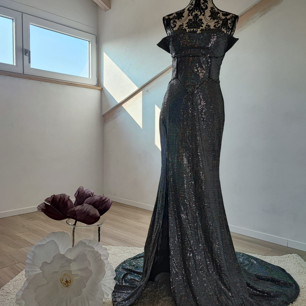 l’abito Velvet Night è un vero tributo al fascino e alla seduzione elegante. la silhouette a sirena avvolge le forme con grazia, mentre il tessuto in paillettes sfumate crea un effetto luminoso e cangiante, catturando la luce ad ogni movimento. senza maniche, l’abito dona libertà e leggerezza, enfatizzando la figura in modo sofisticato. l’ampio spacco frontale aggiunge un tocco di sensualità controllata, bilanciando l’eleganza della linea complessiva. il dettaglio sul seno completa il design con un accento raffinato e femminile, rendendo velvet night perfetto per serate di gala, eventi esclusivi o momenti in cui si desidera brillare con stile e sicurezza. indossarlo significa sentirsi magnetiche, raffinate e protagoniste di ogni ambiente.