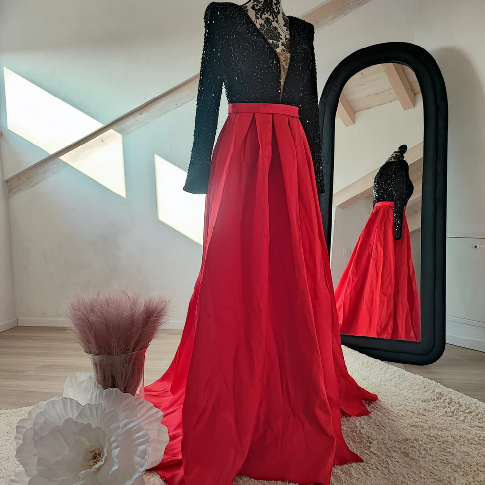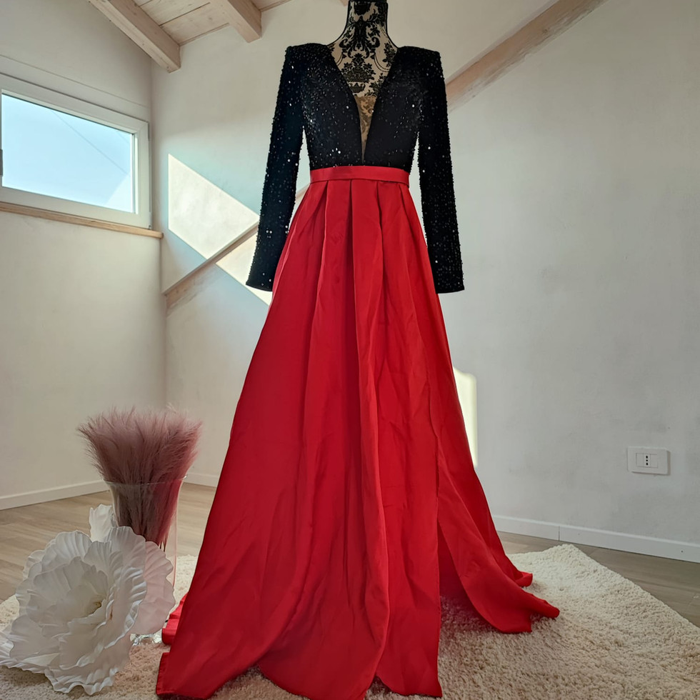 l’abito iris royale è un connubio di eleganza e audacia, pensato per chi vuole distinguersi con stile e sicurezza. il corpino in paillettes nero, impreziosito da spalline coordinate, cattura la luce in modo sofisticato, creando un effetto scintillante e raffinato. la scollatura frontale in rete neutra trasparente aggiunge un tocco sensuale senza eccessi, mentre l’ampia gonna rossa dona movimento, teatralità e un contrasto cromatico deciso. lo spacco laterale completa il design con un dettaglio audace, permettendo libertà di passo e valorizzando la silhouette. Perfetto per serate di gala, eventi esclusivi o occasioni in cui fare un ingresso memorabile, iris royale fa sentire chi lo indossa protagonista, elegante, sicura e irresistibilmente magnetica.