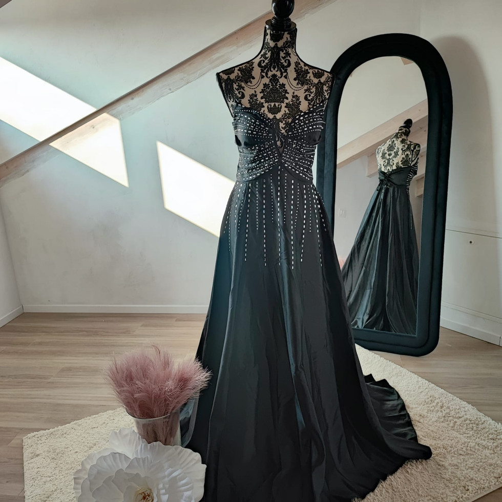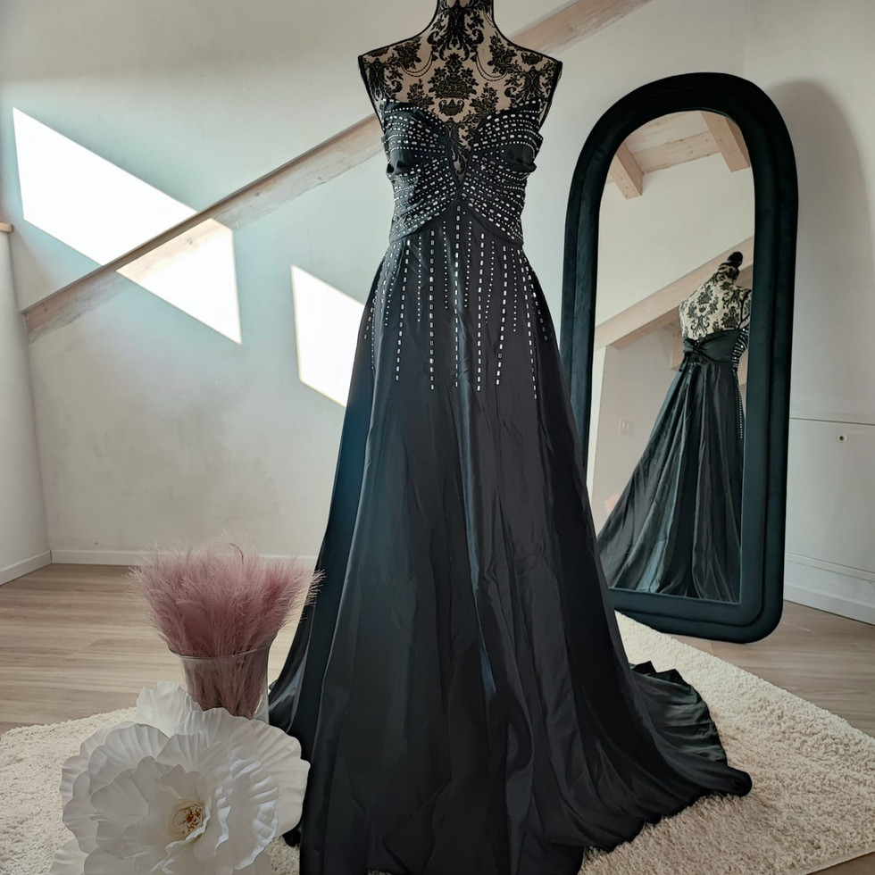 l’abito notte è una celebrazione di eleganza sofisticata e femminilità senza tempo. la silhouette ampia in tessuto raso sostenuto avvolge la figura con grazia, creando un movimento fluido e scenografico ad ogni passo. le decorazioni argentate sulla parte frontale aggiungono un tocco di luce e raffinatezza, catturando lo sguardo in modo discreto ma magnetico. la profonda scollatura frontale conferisce sensualità elegante, bilanciata dalla chiusura a lacci regolabile, che permette una vestibilità personalizzata e confortevole. perfetto per cerimonie, eventi di gala o serate speciali, notte fa sentire chi lo indossa protagonista assoluta, sicura, elegante e avvolta in un’aura di fascino luminoso e raffinato.